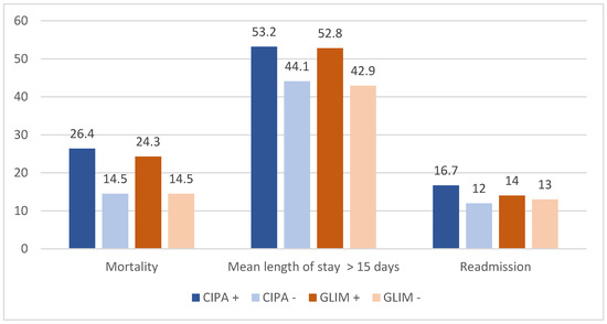 In terms of prognostic outcomes, higher mortality and a longer mean length of stay were found for the positive CIPA patients, and a trend toward higher mortality and a longer mean length of stay were found for the positive GLIM patients. These results are similar to those obtained in previous studies, in which the presence of malnutrition has been associated with worse clinical outcomes [4,7,20,21].
