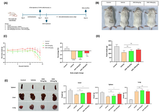 Dalbergia odorifera plant extract improved the symptoms of cancer cachexia in CT26-bearing mice. A schematic representation of the experimental design is illustrated. In general, CT26 tumor cells were intravenously injected into 6-week-old Balb/c mice on day 7, and DOE (50, 100 mg/kg) was orally administrated for 14 days starting after 1 day of tumor inoculation. Healthy mice and the vehicle group received an equal volume of solvent. Body weight and food intake were recorded every day (A). Representative pictures of mice from the four groups at the end of the experiment (B) and the body weight curve show changes in body weight in the four treatment groups over the experiment (C). Mouse body weight (D), food consumption (E), and different organs were compared among the four groups. Values are expressed as the mean ± SEM. A one-way ANOVA was performed with * p < 0.05, ns: not significant.