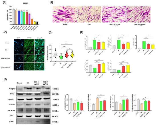 DOE prevents the CM-induced atrophy of C2C12 myotubes. The toxicity of DOE to C2C12 myoblasts was checked by CCK-8 (A). Cell morphology of myotubes from different groups was visualized by LADD (20X magnification) (B) or ICC when nuclei were detected by DAPI (blue) and MYH2 by Alexa Flour 555 at 40X magnification (C). Myotube diameter was measured using ImageJ (D). qRT-PCR was conducted to evaluate the mRNA expression levels of Atrogin1, MuRF, IL6, Myh2, and Igf1 after 24 h of treatment with CM and DOE (E), and the protein expression levels of MuRF1, Atrogin1, MYH2, FOXO3a, p-FOXO3a, AKT, and p-AKT were evaluated using Western blot (F). A one-way ANOVA was carried out to determine significant differences (* p < 0.05, ** p < 0.01, *** p < 0.001, **** p < 0.0001, ns: not significant).