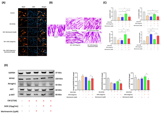 PI3K inhibitor (wortmannin) inhibited the therapeutic effects of DOE in preventing muscle wasting. Wortmannin was added to inhibit the AKT signaling pathway. In general, 1 µM wortmannin was pretreated to cells 1 h before the addition of CM and DOE. After 24 h, cells were stained and harvested for further analysis. Representative images of myofibers were immunostained with the antibody for MYH2 (orange) and counter-stained with DAPI (blue) for visualization of the nucleus (20× magnification) (scale bar = 20 μm) (A), and C2C12 myotubes by LADD staining (20× magnification) (scale bar = 100 px) (B). The expression levels of Igf1, Irs1, Myh2, and Atrogin-1 mRNA in myotubes treated with 15 ug/mL DOE with or without wortmannin for 24 h were measured, and mRNA was normalized against GAPDH (C). The protein levels of AKT, p-AKT, Atrogin1, and MYH2 were measured via Western blot analysis (D). Data are presented as the mean ± SEM. The statistical significance was determined by a one-way ANOVA (* p < 0.05, ** p < 0.01, *** p < 0.001, or **** p < 0.0001, ns: not significant).
