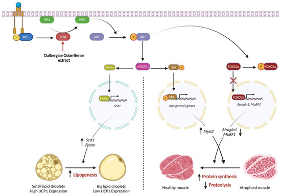 The balance in muscle growth and adipose mass is heavily dependent on the AKT signaling pathway [12,13]. In skeletal muscles, AKT phosphorylation by growth factors and nutrients promotes the activation of downstream targets involved in the stimulation of protein translation and inhibition of protein breakdown through PI3K-dependent processes [14]. However, during cancer cachexia, AKT pathway activity decreases, leading to the activation of the FoxO3α transcription factor and expression of E3 ubiquitin ligases, which induces muscle atrophy [15,16]. The activation of AKT signaling in adipose tissue also regulates the expression of adipogenic transcription factors relating to lipid metabolism, which inhibits lipolysis, and promotes lipid storage and cell differentiation [17]; however, this process is impaired during cachexia, resulting in adipose wasting [18].
