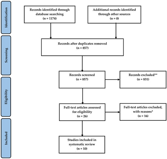 - Page, M.J.; McKenzie, J.E.; Bossuyt, P.M.; Boutron, I.; Hoffmann, T.C.; Mulrow, C.D.; Shamseer, L.; Tetzlaff, J.M.; Akl, E.A.; Brennan, S.E.; et al. The PRISMA 2020 statement: An updated guideline for reporting systematic reviews. BMJ 2021, 372, n71. [Google Scholar] [CrossRef]