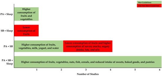 | Sampasa–Kanyinga et al. (2022), Canada [33] | Cross-sectional study | 12,759 children and adolescents, 11–20 yrs | Multivariable ordered logistic regression | Self-reported physical activity | Self-reported screen time, (video games, TV, movies, texting, internet) | Self-reported sleep duration | Frequency of breakfast consumption and fruit and vegetable intake, via self-reported questionnaires | Compliance with all three movement behavior recommendations was associated with more frequent breakfast consumption and higher fruit and vegetable intake compared to those who met none of the recommendations. A dose–response relationship was observed, where meeting more recommendations was linked to increased frequency of breakfast and fruit and vegetable consumption. |