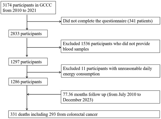 This study utilized data from the Guangdong Colorectal Cancer Cohort (GCCC), an ongoing prospective cohort study aimed at evaluating genetic and environmental factors influencing the survival of individuals diagnosed with colorectal cancer. The cohort was established in July 2010 at the Sun Yat-sen University Cancer Center in Guangzhou, China [32,33]. Potential colorectal cancer patients were screened for eligibility, and subsequent enrollment in the cohort was conducted according to the following inclusion criteria: aged 30–75 years, with a histological diagnosis of primary colorectal cancer (International Classification of Diseases, version 10 [ICD10/C18-C20]) within 3 months of diagnosis, and either being native to Guangdong or having maintained residence in Guangdong for a minimum of 5 years. Patients were not eligible to participate if they had a diagnosis of another type of cancer or if they were unable to communicate or understand Mandarin or Cantonese effectively. A total of 3174 cases were identified for the period between July 2010 and May 2021. Of the aforementioned cases, 2833 were eligible and thus underwent an interview, resulting in a response rate of 89.26%. A total of 1297 blood samples were available and detected from among eligible cases (Figure 1). After excluding 11 cases with unreasonable daily energy consumption information, the final analysis encompassed 1286 cases.