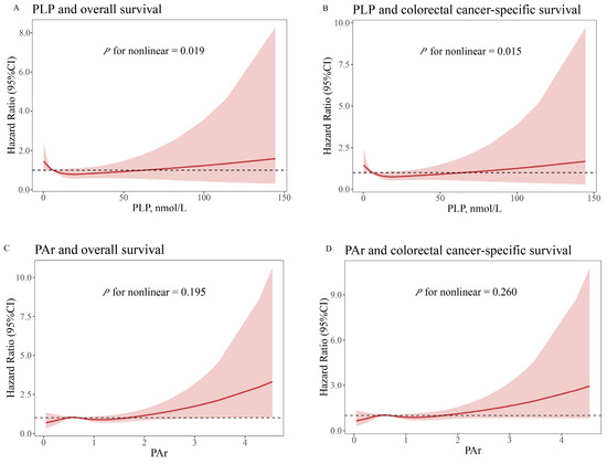 Multivariable-adjusted relationships between serum pyridoxal 5′-phosphate and PAr and survival outcome by the restricted cubic spline model. The solid red line represents the hazard ratio value, the shaded area represents the confidence interval, and the dashed line represents a hazard ratio value of 1. (A) PLP and overall survival. (B) PLP and colorectal cancer-specific survival. (C) PAr and overall survival. (D) PAr and colorectal cancer-specific survival. Cox proportional hazards regression model adjusted for age (continuous), sex (male, female), BMI (continuous), smoking (ever or never), drinking (regular or never), MET (continuous), total energy intake (continuous), protein intake (continuous), degree of differentiation (well-differentiated, moderately differentiated, poorly differentiated), surgery (yes or no), radiotherapy or chemotherapy (yes or no), and history of cancer in first-degree relatives (yes or no). Abbreviations: CI, confidence interval; PLP, pyridoxal 5′-phosphate; PAr, the ratio of PA over the combined concentrations of PLP and PL.