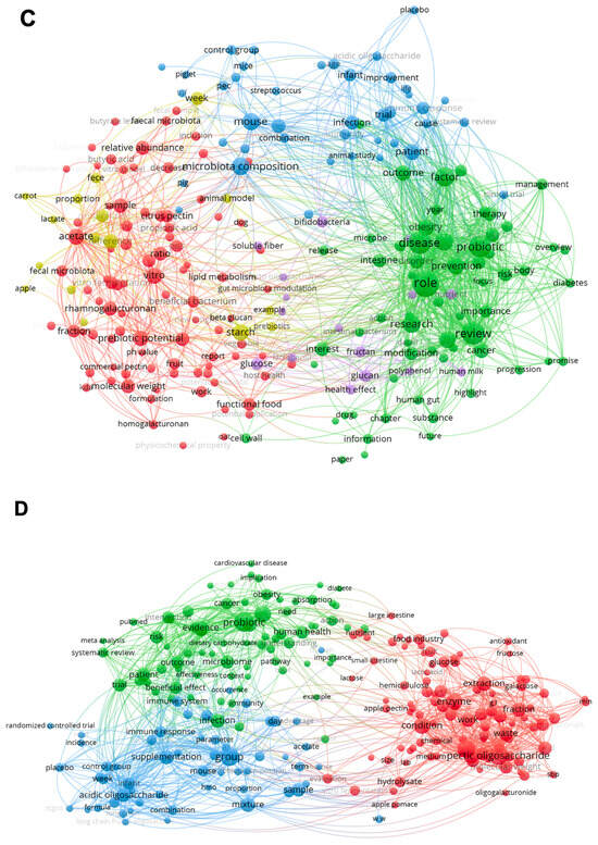 Clusters of words from articles about pectin summarized by keyword co-occurrence in VOSViewer software. (A) Searched keywords “microbiota” and “pectin”; (B) Searched keywords: “prebiotic” and “pectin”; (C) Searched keywords “prebiotic”, “microbiota,” and “pectin”; (D) Searched keywords “prebiotic”, “pectin” and “oligosaccharide”.