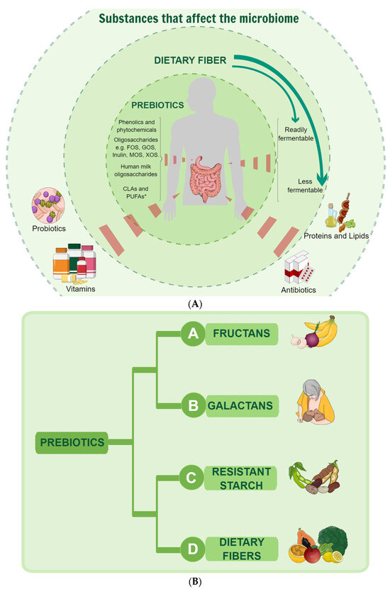 (A) Describing what affects the microbiome and what is considered a prebiotic with the proposed definition. Prebiotics must be selectively utilized by microorganisms and supported by sufficient evidence of health benefits for the host. Additionally, dietary prebiotics should resist degradation by the host’s enzymes. * The figure shows candidate prebiotics in that levels of evidence currently vary, with FOS and GOS being the most researched prebiotics. CLA, conjugated linoleic acid; PUFA, polyunsaturated fatty acid; FOS, fructooligosaccharides; GOS, galactooligosaccharides; MOS, mannanoligosaccharide; XOS, xylooligosaccharide (Based on Gibson et.al. [9]. (B) Demonstrating the principal classes of prebiotics and the examples.