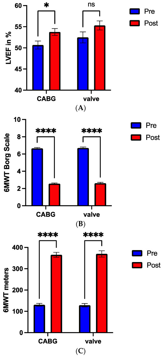 LVEF recovery (A), 6 MWT Borg scale (B), and 6 MWT meters (C) between pre (blue bar) and post (red bar) cardiovascular rehabilitation in CABG compared to valve surgery group. * p < 0.05, **** p < 0.0001, ns: not significant.