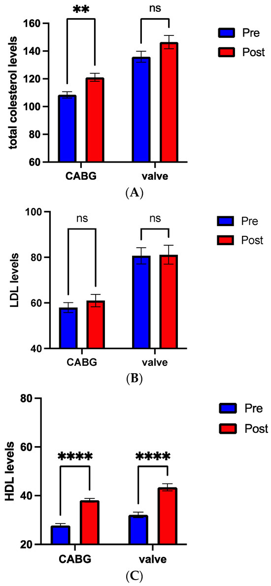 Total cholesterol (A), LDL levels (B), and HDL levels (C) between pre (blue bar) and post (red bar) cardiovascular rehabilitation in coronary artery bypass graft (CABG) compared to valve surgery group. ** p < 0.05, **** p < 0.0001, ns: not significant.