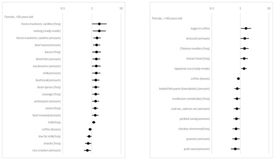 As for fish and seafood, it is notable that five items (horse mackerel, sardine (freq), horse mackerel, sardine (amount), dried fish (amount), sea breams (amount), and amberjack (amount)) are positively correlated with psychosomatic disorders, and no item is associated with a sense of achievement in females under 50 years old (Figure 2 and Figure 3, bottom left). In contrast, no item is associated with psychosomatic disorders, and three items (canned tuna (amount), canned tuna (freq), and squid (amount)) are negatively correlated with a sense of achievement in males under 50 years old (Figure 3, top left).