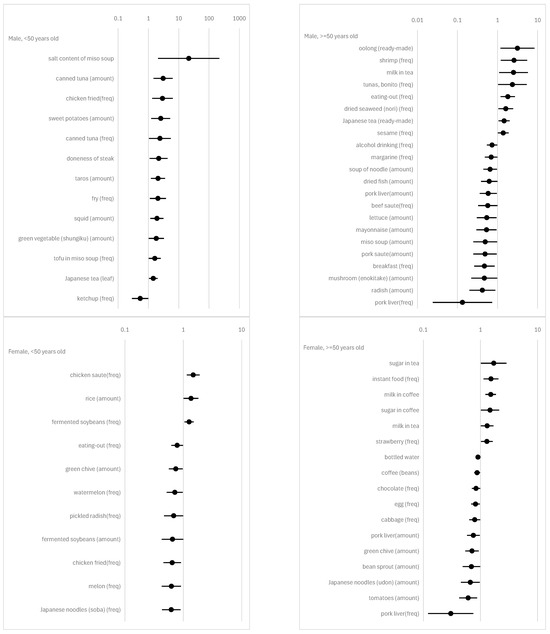 To explore the relationships between dietary habits and psychosomatic disorders or a sense of achievement, we conducted logistic regression analyses. We divided the sample into four groups: (1) males under 50 years old, (2) males aged 50 or older, (3) females under 50 years old, and (4) females aged 50 or older. Our two dependent variables are follows: (1) an indicator of whether the respondent experienced psychosomatic disorders at or above the median level in the subsample, and (2) an indicator of whether the respondent experienced a sense of achievement below the median level in the subsample. The measure for psychosomatic disorders is an eleven-point Likert scale response to the question “To what extent have you experienced physical and/or mental disorders over the past year?”. The sense of achievement is assessed using an eleven-point Likert scale response to the question “To what extent have you achieved what you wanted to do or what you had to do over the past year?”. Supplementary Table S3 provides the results of validation analysis for these two variables as measures of individual stress condition. We performed regressions for each FFQ item. In every regression, we included BMI, SBP, dummy variables for housemates, educational background, and an indicator of full-time employment as confounders. We report odds and their 95% confidence intervals for every regression.