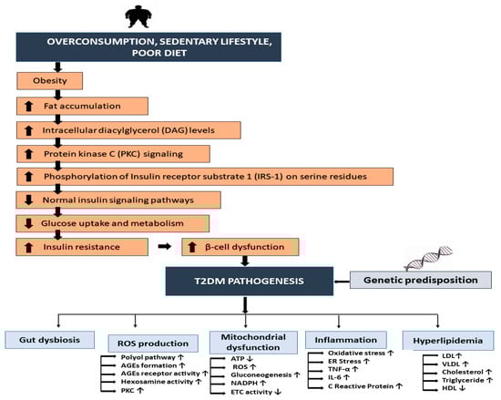 Mechanistic overview of T2DM pathogenesis. Obesity, driven by overconsumption, a sedentary lifestyle, and poor diet, results in increased fat accumulation and intracellular diacylglycerol (DAG) levels, which activate Protein Kinase C (PKC) signaling. This leads to the phosphorylation of Insulin Receptor Substrate 1 (IRS-1) on serine residues, impairing normal insulin signaling pathways, reducing glucose uptake, and increasing insulin resistance. Insulin resistance, in turn, promotes β-cell dysfunction, contributing to the progression of type 2 diabetes mellitus (T2DM). Genetic predisposition further influences the disease’s development. Key processes downstream include gut dysbiosis, reactive oxygen species (ROS) production, mitochondrial dysfunction, inflammation, and hyperlipidemia. Increase (↑) and decrease (↓).