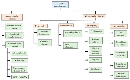 T2DM has been linked to an increased risk of developing Alzheimer’s disease due to the presence of overlapping neurodegenerative markers in both diseases such as oxidative stress, inflammation, and mitochondrial dysfunction [93]. On the other hand, diabetic nephropathy, characterized by microalbuminuria, elevated blood glucose, high hemoglobin A1C (HbA1c), and hypertension, is prevalent in nearly half of T2DM individuals [94,95,96,97]. Diabetic retinopathy is another severe complication of T2DM which occurs when excess blood glucose blocks the capillaries linked with the retina. This increases the risk of eye disorders such as diabetic cataracts, macular edema, and dry eye, and may even result in blindness (Figure 2) [98,99,100,101].