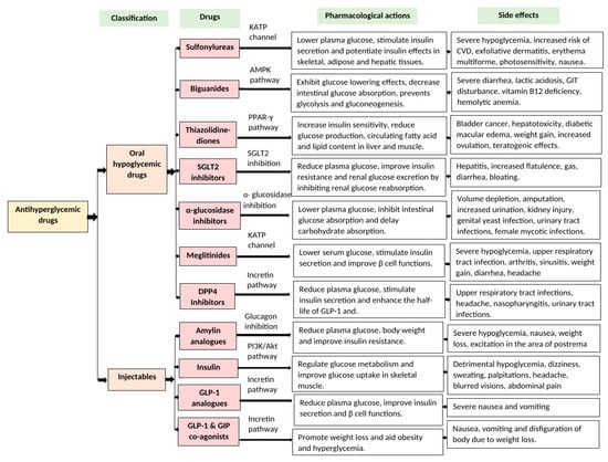 Flow chart of the current oral and injectable antidiabetic drugs, their pharmacological actions, and adverse side effects.