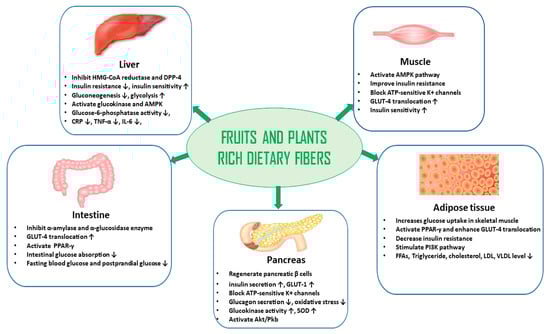 Antidiabetic effects of dietary fiber-rich plants and fruits on various organs and tissues. Dietary fiber-rich herbs and fruits exhibit antihyperglycemic properties by activating several molecular pathways. They may contribute to the regeneration of pancreatic β-cells; increase insulin secretion; enhance insulin sensitivity; increase glucose uptake in tissues; enhance GLUT-4 translocation; increase glycolysis in the liver; activate the AMPK, PPAR-γ, Akt/Pkb, or PI3K pathways in adipose tissue; improve glucokinase activity; reduce insulin resistance; delay intestinal glucose absorption; lower fasting blood sugar and postprandial glucose; reduce glucagon secretion and oxidative stress; inhibit α-amylase, α-glucosidase, DPP-4, and glucose-6-phosphatase enzymatic activity; decrease gluconeogenesis; suppress TNF-α and IL-6 release; and block ATP-sensitive K+ channels in the pancreas and muscle to regulate blood glucose levels. Increase (↑) and decrease (↓).