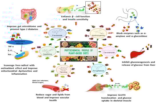 Medicinal plant-based diets, rich in bioactive compounds, have gained attention for their potential in preventing and managing chronic diseases, including diabetes. Phytochemicals such as flavonoids, anthocyanins, carotenoids, saponins, tannins, and polyphenols, found in a variety of plant-based foods such as fruits, vegetables, legumes, and whole grains, play an essential role in managing diabetes. These compounds help regulate blood sugar through a possible multitude of actions, including enhancing insulin sensitivity or secretion, inhibiting enzymes that break down carbohydrates, and reducing glucose production in the liver. They also improve gut health, trigger the release of glucoregulatory or satiating gut hormones, reduce inflammation, and combat oxidative stress, all of which contribute to better overall metabolic function and diabetes prevention (Figure 5) [137].