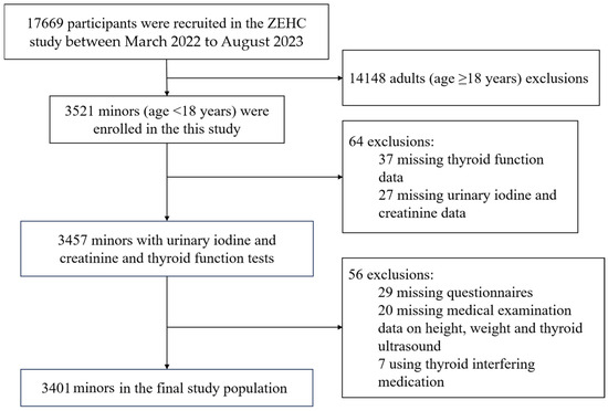 The study population was selected from children and adolescents in the baseline population of the Zhejiang Environmental Health Cohort (ZEHC), an ongoing cohort designed by our team to investigate the associations between the environment and health in Zhejiang Province, China. From March 2022 to August 2023, 17,669 participants were recruited from four representative cities in Zhejiang: Huzhou (north), Jinhua (central), Taizhou (east), and Lishu (south), based on geographic location and economic conditions. The inclusion criteria for ZEHC were as follows: (1) local permanent residents aged 6–69 years; (2) no newly diagnosed or ongoing cancer treatment; (3) no mental illness or cognitive impairment; and (4) no intake of any iodine-containing drugs or contrast agents in the previous three months. In our study, only children and adolescents were selected (age 6–17 years), so adults (age ≥ 18 years) were excluded (n = 14,148). Additionally, those without thyroid function data (n = 37), urine data (n = 27), questionnaires (n = 29), and medical examination (n = 20), as well as those using thyroid-interfering medication (n = 7), were also excluded. Finally, 3401 children and adolescents (age 6–17 years) were included in the analysis. A participant survey flowchart is shown in Figure 1.