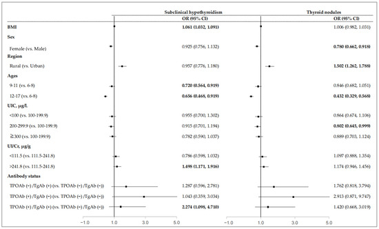 As shown in Figure 2, females had a lower risk of thyroid nodules (OR = 0.780, 95% CI: 0.662–0.918), while participants living in rural areas had a higher risk of thyroid nodules (OR = 1.502, 95% CI: 1.262–1.788). BMI was positively associated with the prevalence of subclinical hypothyroidism (OR = 1.061, 95% CI: 1.032–1.091). Compared with the age 6–8 group, the risk of subclinical hypothyroidism was lower in the age 9–11 and 12–17 groups (OR = 0.720, 95% CI: 0.564–0.919 for the age 9–11 group; OR = 0.656, 95% CI = 0.468–0.919 for the age 12–17 group), and the risk of thyroid nodules was lower in the age 12–17 group (OR = 0.432, 95% CI: 0.329–0.568). More than adequate iodine intake (UIC 200–299.9 µg/L) was inversely associated with thyroid nodules (OR = 0.802, 95% CI: 0.645–0.999). Participants with high UI/Cr levels (>241.8 µg/g) were at a higher risk of subclinical hypothyroidism (OR = 1.498, 95% CI: 1.171–1.916). Compared with the negative antibody group, the positive d-Ab group had a higher risk of subclinical hypothyroidism (OR = 2.274, 95% CI: 1.171–1.916).