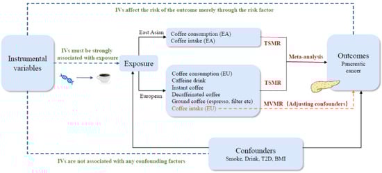 Mendelian randomization (MR) is a method that involves using genetic variants or modifiable exposures associated with biomarkers to investigate the causal effects of these factors on disease outcomes [14]. The MR design can strengthen causal inference [15] and reduce the impact of residual confounding and reverse causation [16]. Building on the strength of MR analysis, this study employed MR to reveal the causal effect between coffee and pancreatic cancer risk.