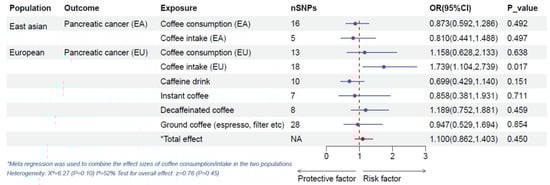 Figure 2 shows the TSMR analysis and meta-analysis of an extra cup of coffee per day and pancreatic cancer risk. In the East Asian population, there was no statistical association between an additional cup of coffee per day and pancreatic cancer risk (p = 0.492 and 0.497, respectively). Similarly, in the European population, most TSMR analyses do not support an association between an extra cup of coffee per day and pancreatic cancer risk, regardless of coffee type (including caffeine drinks, instant coffee, decaffeinated coffee, ground coffee, etc.). However, an independent TSMR analysis (‘Coffee intake (EU)’, one of the coffee phenotypes) found that coffee was associated with an increased risk of pancreatic cancer (IVW: OR = 1.739, 95%CI = 1.104–2.739, p = 0.017). But this statistical association became insignificant when the other two methods of analysis were used (MR-Egger: OR = 1.808, 95%CI 0.736–4.441, p = 0.215; weighted median: OR = 1.409, 95%CI = 0.767–2.591, p = 0.269), as shown in Table S13. Also, estimates of coffee consumption/intake in East Asian and European populations were combined using a fixed-effects meta-analysis, and the results showed no statistically significant association between an extra cup of coffee per day and pancreatic cancer risk (OR = 1.100, 95%CI = 0.862–1.403, p = 0.450; p for heterogeneity = 0.10, I2 = 52%).