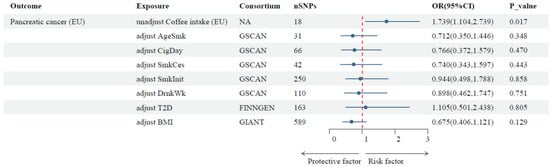 The following supporting information can be downloaded at: https://www.mdpi.com/article/10.3390/nu16213723/s1, Table S1: The detail information of outcomes and exposure phenotypes included in this study; Table S2: Eliminating SNPs associated with known confounding factors; Table S3: Power calculations for Mendelian Randomization; Table S4: Single nucleotide polymorphisms used as instrumental variables in the analysis of TSMR; Table S5–S11: Instrumental variables of AgeSmk, CigDay, SmkCes, SmkInit, DrnkWk, T2D, BMI in the MVMR analyses of pancreatic cancer and coffee intake (EU); Table S12: F-statistics for all multivariable MR analyses; Table S13: TSMR analysis among coffee phenotypes and pancreatic cancer; Table S14: Results of multivariable Mendelian randomization adjusting potential confounders.