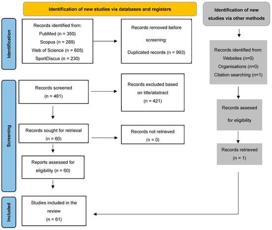 The database search identified 1474 records. After removing the duplicates, 993 records were excluded. After screening the titles and abstracts, 421 records were excluded. The full text of the 60 reports was assessed for eligibility. Additionally, one record was added using other methods. In total, 61 studies, 34 experimental and 27 descriptive trials, involving a total sample of 1111 adult soccer players (659 men and 452 women), met the inclusion criteria and were extracted for qualitative analysis. Study identification, screening, and selection process using the PRISMA flow diagram is illustrated in Figure 1.