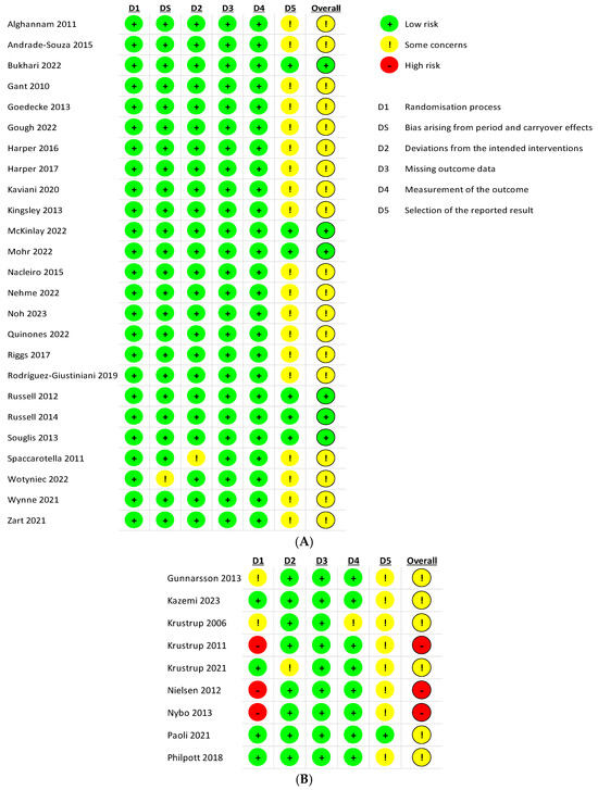 Independently, two authors (M.P. and C.G.) judged the risk of bias of the included studies using Risk of Bias 2 (RoB 2), recommended by the Cochrane Handbook for Systematic Reviews (5.1.0) [31], to assess the risk of bias of the experimental studies included in the review (Figure 2), for both crossover trials (25 studies) [32] (Figure 2A) and parallel trials (9 studies) [33] (Figure 2B). Disagreements were settled by consensus among authors or through consultation with a third reviewer (J.C.).