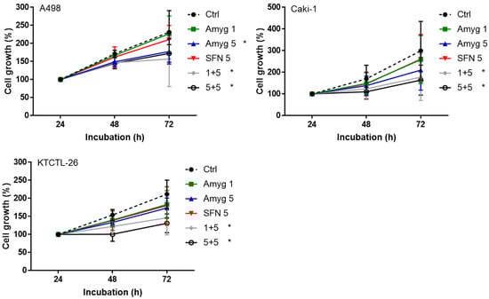 Influence of 5 µM sulforaphane (SFN 5), 1 mg/mL or 5 mg/mL amygdalin (Amyg 1, Amyg 5) or the drug combination (5 µM SFN + 1 mg/mL amygdalin, 1 + 5, 5 µM SFN + 5 mg/mL amygdalin, 5 + 5) on cell growth in Caki1, A498, and KTCTL-26 cells. Cells were exposed to the drugs and evaluated after 24 (set to 100%), 48, and 72 h by the MTT assay. Controls (Ctrl) remained untreated. * indicates significant difference to the controls (One-way ANOVA). n = 4.