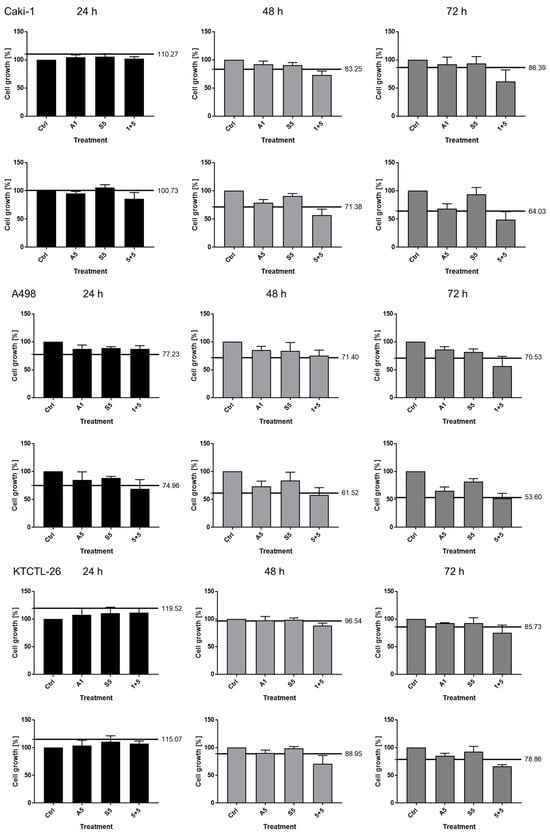 Based on the Bliss independence model, synergistic inhibitory effects were already achieved after 24 h in all cell lines in the presence of SFN plus 5 mg/mL amygdalin (Figure 2). Effects on Caki-1 cells were strongest. Following 72 h treatment, synergism was seen even when SFN was combined with the lower amygdalin concentration of 1 mg/mL. Caki-1 and A-498 cells were more sensitive to the drug combination, compared to KTCTL-26 cells.