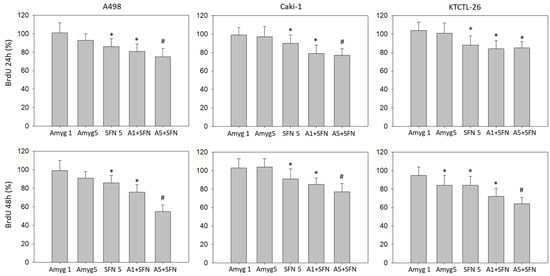 Evaluation of cell proliferation with the BrdU incorporation test. The RCC cell lines A498, Caki-1, and KTCTL-26 were exposed to 1 mg/mL or 5 mg/mL amygdalin (Amyg 1, Amyg 5), to 5 µM sulforaphane (SFN 5) or to the amygdalin-SFN drug combination (A1 + SFN, A5 + SFN) for 24 or 48 h and then subjected to assay. Error bars indicate standard deviation. * indicates significant down-regulation, compared to untreated controls set to 100%. # indicates significant down-regulation of the drug combination, compared to single drug use (Two-way ANOVA). n = 3.