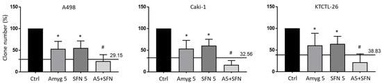 Clonogenic growth assay. Number of A498, Caki-1, and KTCTL-26 cell clones exposed to 5 mg/mL amygdalin (Amyg 5), 5 µM sulforaphane (SFN 5), or both (A5 + SFN). Controls (Ctrl) were incubated in cell culture medium alone. Error bars indicate standard deviation. * indicates significant difference to untreated controls, set to 100%. # indicates significant difference of the drug combination, compared to single drug use (Two-way ANOVA). The calculated effect from the Bliss independence model is displayed as a black line. Effect of the combination above the line = antagonistic effect, on the line = additive effect, below the line = synergistic effect. n = 3.