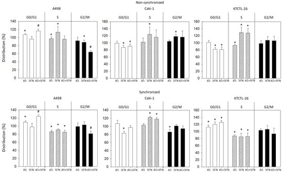 Influence of 5 mg/mL amygdalin (A5), 5 µM sulforaphane (SFN), or both (A5 + SFN) on proportionate G0/G1, S, and G2/M-phases in A498, Caki-1, and KTCTL-26 cell lines. The upper part of the figure shows data from non-synchronized cells, the lower part from synchronized cells. Mean of three experiments. * indicates significant difference to untreated controls (set to 100%). # indicates significant difference of the drug combination, compared to single drug use (Two-way ANOVA).