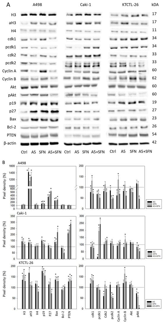 SFN diminished only a few proteins: pcdk2 (A498), pAkt (Caki-1, KTCTL-26), and Bcl-2 (KTCTL-26). It, however, enhanced the following proteins: cdk1 (A498, KTCTL-26), pcdk1 (all cell lines), pcdk2 (KTCTL-26), Cyclin A (A498), Cyclin B (KTCTL-26), p19 (all cell lines), p27 (A498), Bax (all cell lines).