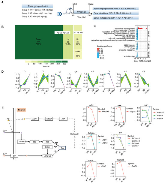 Administration of xanthohumol (Xn) at 0.5 mg/kg/day represses neuron apoptosis pathway in the AD hippocampus. (A) Schematic diagram of the experimental design. (B) The number and percentage of up- and downregulated proteins in AD vs. WT and AD+Xn vs. AD. (C) Gene set enrichment analysis (GSEA) of differentially expressed proteins (DEPs) in AD+Xn compared to AD, including biological processes (BPs), cellular components (CCs), and molecular functions (MFs). (D) Trend clustering results of proteins detected in the hippocampi from the WT, AD, and AD+Xn mice using the fuzzy c-means algorithm. Each line represents a gene. The color of the line indicates the membership value, which was generated by mfuzz.plot in the Mfuzz R package. The membership value can vary continuously between zero and one, indicating how well the gene is represented by the cluster. Low values (green) indicate a poor representation of the gene by the cluster, while high values (blue and purple) indicate a strong representation. (E) Well-known associations of proteins within the ASK1/JNK and Cdk5/GSK3β cascades with Aβ and tau phosphorylation, as recorded in the KEGG database (details are provided in Figure S1). Expression trends of these proteins across three groups of mice. The Y axis represents the normalized expression value estimated by Mfuzzy.