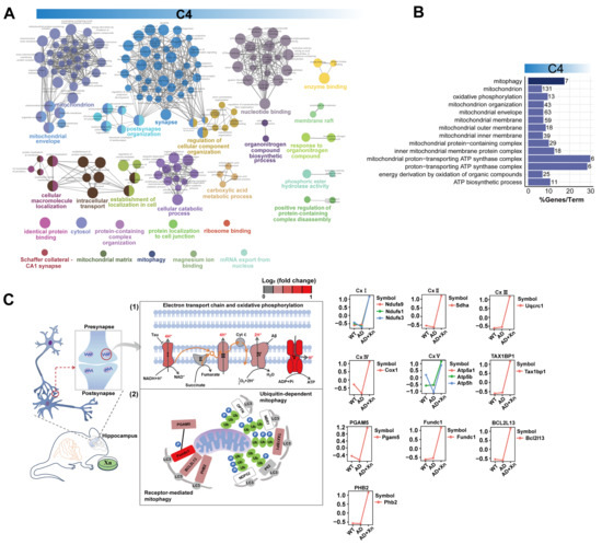Administration of Xn modulates mitochondrial bioenergetics and mitophagy in AD hippocampus. (A) A network showing the internal relationship between GO terms enriched by the C4 proteins. (B) The pathways were associated with mitophagy, mitochondrial architecture, and function, the bar chart colors align with those in panel (A). The values on the bars represent the number of enriched genes, and the height of the bars indicates the percentage of enriched genes out of the total genes in the pathway. (C) Expression trends of proteins that were associated with (1) oxidative phosphorylation and (2) mitophagy. The Y axis represents the normalized expression value estimated by Mfuzzy.