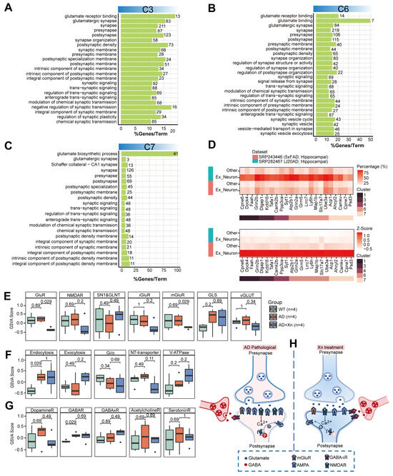 Administration of Xn downregulates C3, C6, and C7 proteins that were involved in the glutamate–glutamine cycle. (A–C) The number and percentage of protein-coding genes that were associated with glutamatergic synaptic pathways in C3, C6, and C7. The values on the bars represent the number of enriched genes, and the height of the bars indicates the percentage of enriched genes out of the total genes in the pathway. (D) The scRNA-seq datasets (SRP243446 and SRP282467) showing the expression levels of 23 genes highly expressed in excitatory neurons across different clusters. GSVA scores of gene sets involved in (E) glutamatergic neuron, (F) vesicular circulation, and (G) other types of neuron, where the points represent outliers. (H) Integration of results from panels (A–G) to provide an overview of receptors on synapses responding to Xn administration.
