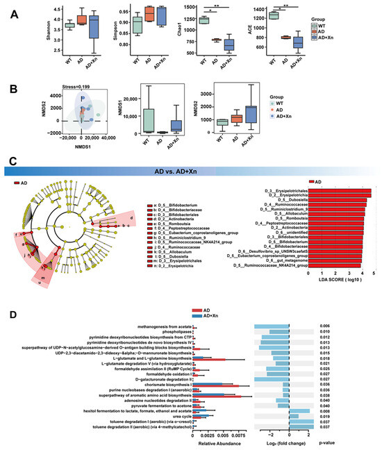 Differential enrichment of gut microbes in AD+Xn and AD groups. (A) Comparison of gut microbial community α-diversity, including estimates of community richness (Chao1 and ACE) and community diversity (Shannon, Simpson) across groups (* p < 0.05, ** p < 0.01, analyzed by t-test). (B) Comparison of gut microbial β-diversity, including Bray–Curtis principal coordinate analysis (PCoA) and non-metric multidimensional scaling (NMDS) across groups (WT, AD, AD+Xn). (C) The gut microbiota was differentially abundant between the AD and AD+Xn mice. The cladogram shows taxonomic levels from phylum to species, with circle size reflecting relative abundance. Red represents groups significantly abundant in AD (linear discriminant analysis (LDA) effect size (LEfSe): p-value < 0.05, LDA > 2.0). (D) The relative abundance of Kyoto Encyclopedia of Genes and Genomes (KEGG) modules was annotated by PICRUSt2 (v 2.5.3) software. The colors highlight enrichment in the AD (red) and AD+Xn (blue) groups. The differential KEGG pathways were identified with log2 (fold changes) and p-value < 0.05 between the AD and AD+Xn groups.