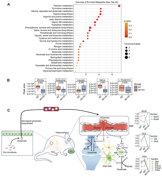 (A) The top 25 metabolic pathways enriched by detected metabolites. (B) Serum metabolite peak areas of branched-chain amino acids (BCAAs, including leucine, isoleucine, and valine) and L-glutamine were compared between AD and AD+Xn groups. A p-value < 0.05 was considered statistically significant. (C) Overview of glutamatergic neuron de-excitability by Xn through reducing blood- and gut-derived glutamate synthesis. α-KG, α-ketoglutarate; BCAT, branched-chain aminotransferase; BCKA, branched-chain α-keto acid; GLS, glutaminase; Pyr, pyruvate; Cit, citrate; Mal, malate; Oxa, oxaloacetate; PC, pyruvate carboxylase; PDH, pyruvate dehydrogenase.