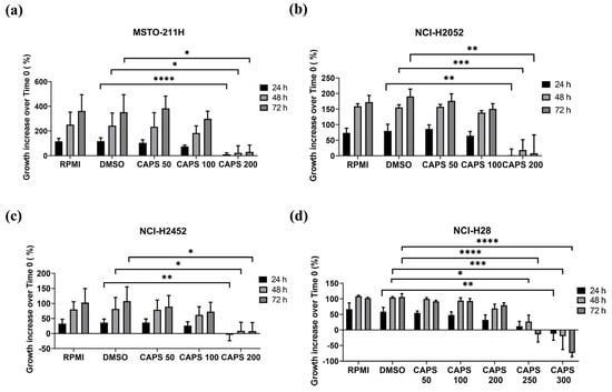 Following 24, 48 and 72 h of CAPS treatment (50, 100, 200, 250 and 300 µM), IC50 values were calculated for MSTO-211H, NCI-H2052, NCI-H2452 and NCI-H28 cells by GraphPad Prism 8 software through a dose–response curve, selecting log(inhibitor) vs. normalized response-variable slope.