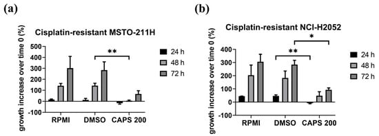 Since occurrence of resistance to conventional chemotherapeutic drugs, such as cisplatin, results in treatment failure in patients [,,], we evaluated the effect of CAPS on cell growth of cisplatin-resistant MSTO-211H and NCI-H2052 cells, generated in our laboratory following prolonged exposure to increasing concentrations of cisplatin [], as described in Section 2. Significantly, treatment with CAPS 200 µM reduced cell proliferation of both cisplatin-resistant MSTO-211H and NCI-H2052 cells as compared to DMSO-treated cells (Figure 2a,b). Since no cytotoxicity of DMSO was observed in cisplatin-resistant cells, the antiproliferative effects were indeed related to CAPS action.