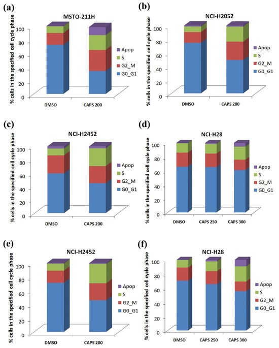 Since we did not observe significant differences in cell cycle distribution following treatment with CAPS for 48 h in both NCI-H2452 and NCI-H28 cells, we further investigated the effects of CAPS on cell cycle in these cell lines after 72 h of treatment (Figure 3e,f).