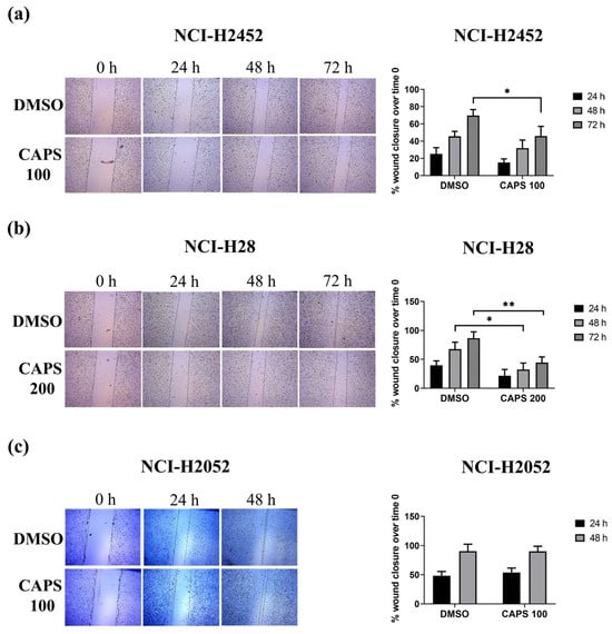 A confluent monolayer of NCI-H2052, NCI-H2452 and NCI-H28 cells, seeded onto 6-well plates, was wounded using a 200 μL micropipette tip. After washing with Dulbecco’s phosphate-buffered saline (DPBS) (Gibco, Thermo Fisher Scientific), the cells were treated with medium containing DMSO or CAPS at concentrations that did not affect cell proliferation. Images of the wounded area were acquired by a DMi1 (Leica, Wetzlar, Germany) microscope (4× objective) both at time 0 (immediately after scratching) and at 24, 48 and 72 h of treatment until wound closure. The images were examined by using Wound_healing_size_tool update, an ImageJ/Fiji® plugin [,]. The wound closure rate was measured as follows: