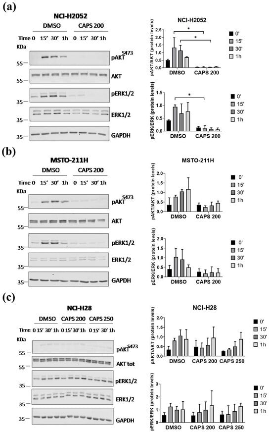 The results were slightly different in NCI-H28 cells. Notably, NCI-H28 cells showed rapid activation of AKT, which was not as strong as demonstrated in NCI-H2052 and MSTO-211H cells, and strong ERK1/2 activation. Significantly, treatment with CAPS at concentrations of 200 µM or 250 µM only resulted in delayed activation of AKT in NCI-H28 cells, which was detectable at 1 h of serum stimulation (Figure 7c). In contrast, CAPS at a concentration of 200 µM did not markedly reduce ERK1/2 activation, whereas at a concentration of 250 µM, it resulted in delayed ERK1/2 activation (Figure 7c).