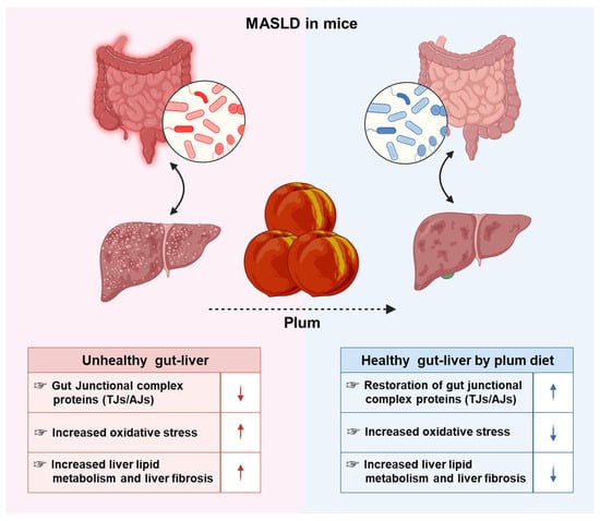 This summary highlights the protective effects of plum against oxidative stress, intestinal permeability, and liver fibrosis induced by diet high in fat, fructose, and cholesterol. The left and right illustrations indicate an increase in these parameters in the metabolic dysfunction-associated fatty liver disease mouse model and a decrease in each parameter owing to the plum diet, respectively. Upward and downward arrows also represent increase and decrease, respectively.