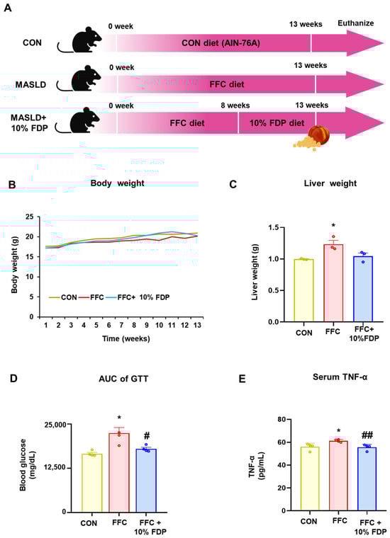 The hepatoprotective effect of 10% FDP against liver disease was assessed in MASLD mice fed an FFC diet (Figure 2A). There were no significant differences in body weight change (Figure 2B). Liver weight increased significantly in the FFC group compared to that in the control group, whereas it was reduced in the 10% FDP group (Figure 2C). The oral glucose tolerance test (OGTT) was performed to assess glucose tolerance in MASLD mice induced by FCC diets. Therefore, OGTT was increased in the FFC group compared to that in the control group but was reduced compared to normal values in the FFC + 10% FDP-treated group (Figure 2D). Enzyme-linked immunosorbent assay (ELISA) analysis revealed that MASLD mice exhibited increased serum TNF-α levels, which were significantly reduced through 10% FDP treatment (Figure 2E). Therefore, 10% FDP treatment prevented inflammation in the MASLD mouse models. In summary, we demonstrated that 10% FDP treatment reduces increased glucose tolerance and inflammation levels in an FFC-induced MASLD mouse model.