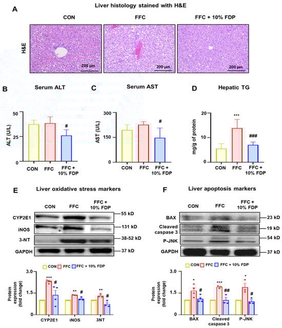 To determine the degree of liver damage in the MASLD mouse model, we assessed liver images and tissue staining. Liver imaging revealed damage in the FFC group compared with that in the control group. However, 10% FDP treatment alleviated these abnormalities in the liver (Supplementary Figure S1). Histological examination of H&E-stained slides revealed increased hepatic lipid droplets and inflammation in the FFC group relative to that in the control group, which was significantly reduced by dietary intervention with 10% FDP (Figure 3A). Additionally, serum levels of ALT and aspartate aminotransferase (AST) were significantly higher in the FFC group than that in the control group; however, these elevations were reduced by the 10% FDP dietary intervention (Figure 3B,C). Moreover, the hepatic TG levels were significantly increased in the FFC group, and the dietary intervention with 10% FDP significantly reduced the elevated TG levels (Figure 3D). Furthermore, liver oxidative stress markers (cytochrome P450 2E1 [CYP2E1], inducible nitric oxide synthase [iNOS], and 3-nitrotyrosine [3-NT]) and apoptotic markers (Bax, cleaved caspase 3, and phosphorylated c-Jun N-terminal kinase) were significantly increased in the FFC group. However, these levels were significantly reduced following dietary intervention with 10% FDP (Figure 3E,F). These findings indicate that FDP may offer protection against FFC-associated liver damage by reducing the elevated levels of oxidative stress and apoptosis markers.