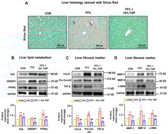 The protective effects of FDP against liver fibrosis were assessed using a MASLD mouse model. Sirius Red staining revealed larger regions of liver fibrosis in the FFC group than that in the control group, indicating that prolonged exposure to the FFC diet resulted in hepatic fibrosis in mice. However, reduced fibrotic areas were observed in the 10% FDP-treated groups compared to that in the control group (Figure 4A). Additionally, liver lipid metabolism (fatty acid synthase [FAS], sterol regulatory element-binding protein 1 [SREBP1], and peroxisome proliferator-activated receptor gamma) and fibrosis (collagen type I alpha [COL/A], PRO-COL/A2, transforming growth factor beta [TGF-β], matrix metalloproteinase [MMP]2, MMP9, and alpha-smooth muscle actin [α-SMA]) markers were increased in the FFC-treated group. However, these increases were significantly reduced by the dietary intervention with 10% FDP (Figure 4B–D). These results indicate that FDP exhibits a beneficial effect on FFC-associated liver fibrosis by suppressing the expression of fibrosis markers.
