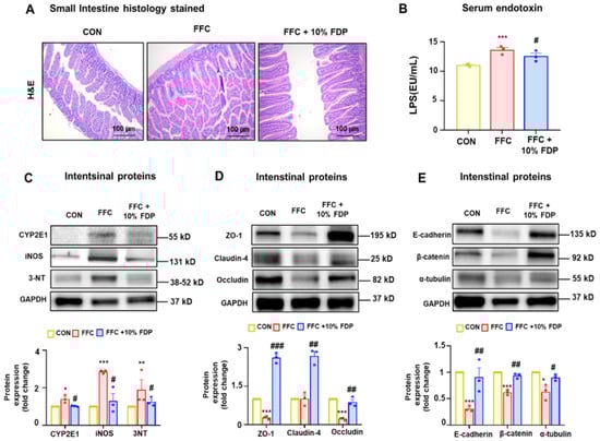 Recent studies have highlighted the association between the intestinal microbiome and non-alcoholic fatty liver disease (NAFLD). An imbalance in gut microbes can affect the progression of NAFLD by disrupting the gut–liver axis regulation [,,]. Therefore, we confirmed gut damage and leaky gut owing to MASLD. H&E-stained histological analysis demonstrated that dietary intervention with 10% FDP enhanced the abnormal gut villus structure caused by the FFC diet (Figure 5A). Additionally, serum endotoxin levels were increased in the FFC group but this increase was significantly mitigated by the 10% FDP intervention (Figure 5B). Moreover, oxidative stress markers (CYP2E1, iNOS, and 3-NT) and junctional complex proteins (zonula occludens-1 [ZO-1], claudin-4, occludin, E-cadherin, β-catenin, and α-tubulin) in the small intestine were reduced in the FFC group but were restored in the 10% FDP-treated group (Figure 5C–E). In summary, in MASLD mice, FDP dietary intervention significantly reduced leaky gut and endotoxemia by increasing junctional complex proteins. This indicates the significance of plum dietary intervention against MASLD-mediated gut and liver damage and its role as a protective agent.