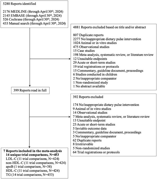 We included randomized controlled trials in adults of all health backgrounds with intervention periods of at least 3 weeks that investigated the effect of dietary pulse consumption in the form of extracted pulse proteins compared with a non-pulse containing control on LDL-C and other lipids, including non-high-density lipoprotein-cholesterol (non-HDL-C), apolipoprotein B (apoB), high-density lipoprotein-cholesterol (HDL-C), and triglycerides (TGs). We required the follow-up period to be ≥3 weeks, a duration that aligns with the US Food and Drug Administration (FDA) framework for the scientific evaluation of lipid-lowering health claims [20].
