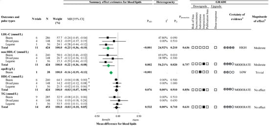 A summary plot of the effect of extracted pulse proteins on blood lipids in randomized controlled trials. Data are expressed as weighted mean differences with 95% confidence intervals of the summary effect estimates using the generic inverse variance method modeled by random effect (≥5 trial comparisons) or fixed effect (<5 trial comparisons) meta-analyses. The between-study heterogeneity was assessed using the Cochran Q statistic, where PQ < 0.100 was considered statistically significant, and quantified by the I2 statistic, where I2 ≥ 50% was considered evidence of substantial heterogeneity. The effect estimates of total extracted pulse proteins from different sources are denoted as diamonds. The effect estimates of individual extracted pulse protein types are denoted as squares. Any statistically significant reductions are highlighted in green. The grading of recommendations, assessment, development, and evaluation (GRADE) of randomized controlled trials are rated as having a “high” certainty of evidence and can be downgraded by 5 domains and upgraded by 1 domain. The white squares represent no downgrades, filled black squares indicate a single downgrade or upgrade for each outcome, and the black square with a white “2” indicates a double downgrade for each outcome. a Because all included trials were randomized controlled trials, the certainty of the evidence was graded as high for all outcomes by default and then downgraded or upgraded based on prespecified criteria. Criteria for downgrades included risk of bias (ROB) (downgraded if most trials were considered to be at high ROB); inconsistency (downgraded if there was substantial unexplained heterogeneity: I2 ≥ 50%; PQ < 0.10); indirectness (downgraded if there were factors absent or present relating to the participants, interventions, or outcomes that limited the generalizability of the results); imprecision (downgraded if the 95% confidence intervals crossed the minimally important difference (MID) for harm or benefit set at 0.1 mmol/L (5%) for LDL-C, non-HDL-C, HDL-C, and TG and ± 0.04 g/L for apoB [32,33,34,35], or there was a concern with the robustness of the estimate resulting from sensitivity analyses); and publication bias (downgraded if there was evidence of publication bias based on the funnel plot asymmetry and/or significant Egger’s or Begg’s test (p < 0.10) with the confirmation of evidence of small study effects by adjustment using the trim-and-fill analysis of Duval and Tweedie [42]). The criteria for upgrades included a significant dose–response gradient that supports the direction of the pooled effect estimate. Please see Supplemental Table S7 for details on the GRADE assessment. b For the interpretation of the magnitude, we used the MIDs (see a) to assess the importance of the magnitude of our point estimate using the effect size categories according to the new GRADE guidance [51,52,53] as follows: a large effect (≥5× MID); moderate effect (≥2× MID); small important effect (≥1× MID); and trivial/unimportant effect (<1 MID). Please see Supplemental Table S7 for details on the GRADE assessment. * Owing to the difference in the directionality of HDL-C compared with the other outcomes with regards to signal for benefit or harm, the sign for the MD was changed. apoB, apolipoprotein B; CI, confidence interval; GRADE, grading of recommendations, assessment, development, and evaluation; HDL-C, high-density lipoprotein cholesterol; LDL-C, low-density lipoprotein cholesterol; MD, mean difference; N, number; non-HDL-C, non-high-density lipoprotein cholesterol; PMD, p-value of the mean difference; PQ, p-value of the heterogeneity; ROB, risk of bias; TG, triglycerides.